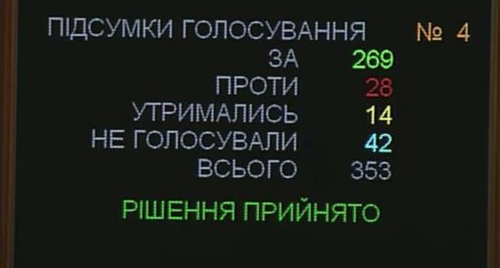 За відповідне рішення на пленарному засіданні Ради проголосували 269 парламентаріїв при необхідному мінімумі в 226 голосів.