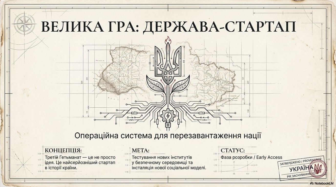 Велика гра – це держава-стартап у фазі розробки або, іншими словами, операційна система для тестування нових інститутів. Ігрова метафора використовується для мобілізації творчої енергії, але за нею стоїть прагматичний інженерний підхід і найсерйозніший стартап в історії країни.