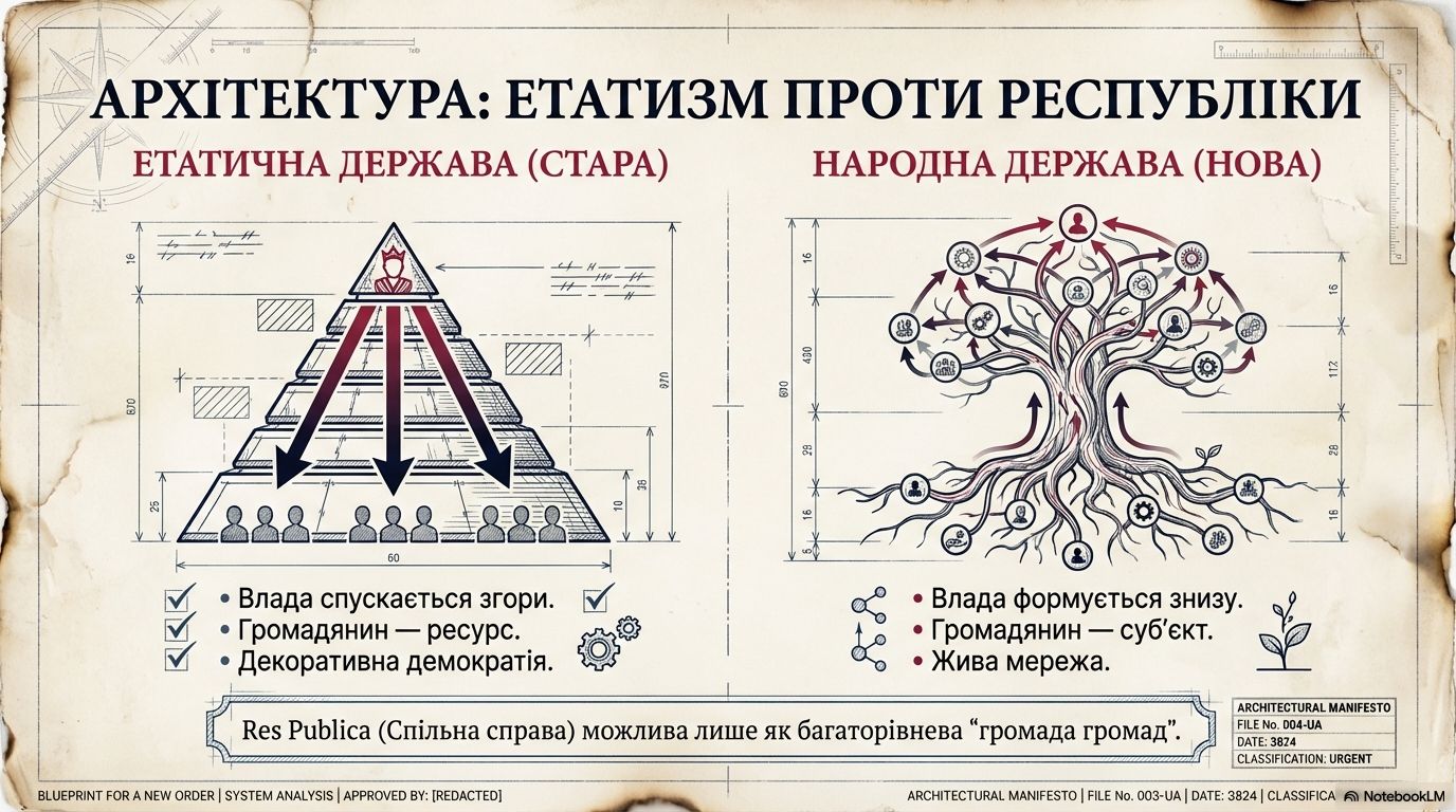У народній державі (республіці) джерелом влади є організовані групи людей, які формують органи влади знизу догори. Справжня республіка (res publica – «спільна справа») можлива лише як багаторівнева «громада громад». Це жива мережа, де кожен вузол має власну волю та відповідальність.