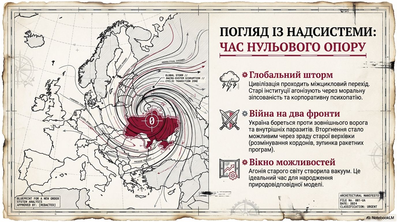 Україна не існує ізольовано – уся наша цивілізація переживає міжцикловий перехід, співмірний за своєю глибиною та наслідками з найбільшими трансформаціями минулого. Старий світ, збудований на примусі та знеособлених соціальних мегамашинах, агонізує. Його інституції, від глобальних організацій до національних урядів, демонструють моральну зіпсованість, безпорадність та «психопатичне переродження» – глибоке зараження корпоративними психопатами.