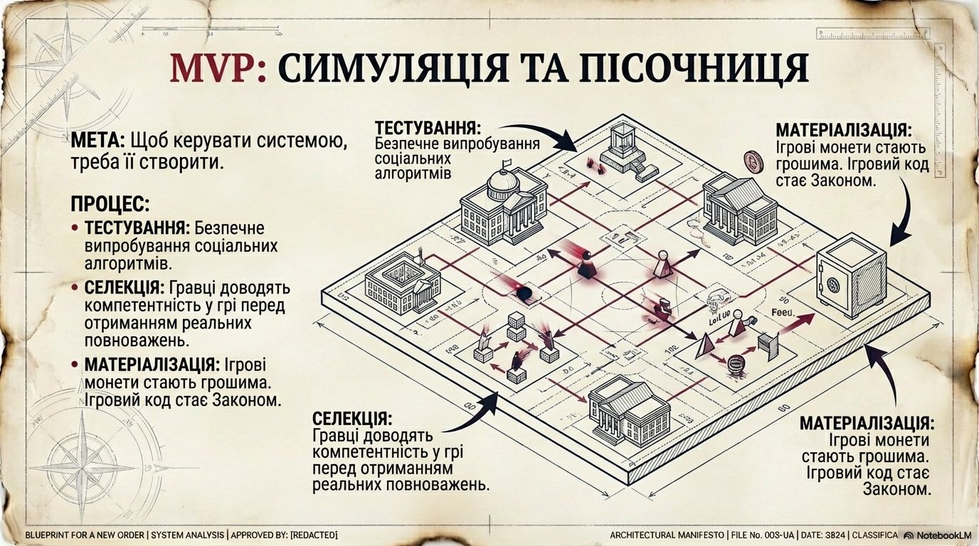 Українська Вільна Держава починається не з кабінетів, а з ігрової симуляції. Це дозволяє нам тестувати соціальні алгоритми в безпечному середовищі («пісочниці»), перш ніж вони стануть частиною реальної інфраструктури.