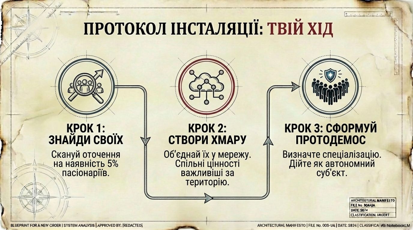 Протодемос – це зародок майбутньої мережевої держави. Спільно визначте спеціалізацію вашої групи: що ви можете запропонувати світові вже зараз? Це може бути розробка софту для демосів, аналітичний центр, освітній ресурс для популяризації Третього Гетьманату. Почніть діяти як автономний вузол, що керується власною волею.